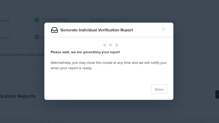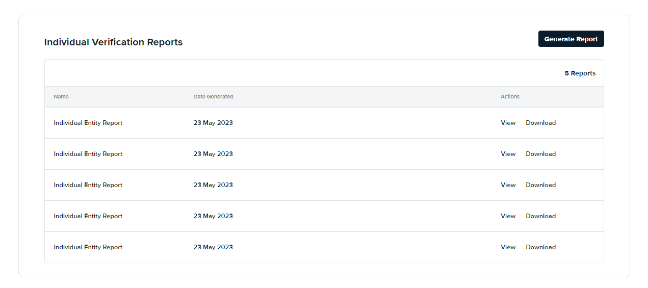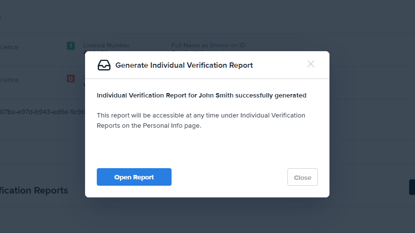 This report can be used as a certificate, or a reference for auditing purposes. As part of your customer onboarding flow, you may require an Individual Verification Report to be attached to your records for reference. Users can request and download a PDF report via the Generate Individual Verification Report API or Portal, and attach the download to their records.