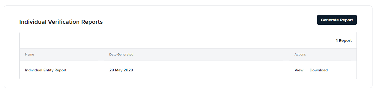 To access Individual Entity Reports, proceed to the Personal Info tab of an Individual entity. The page features a section called Individual Verification Reports, used to handle the generation, display and download of these reports. Select View to review the generated PDF file on your browser, or select Download to save a copy in your computer.