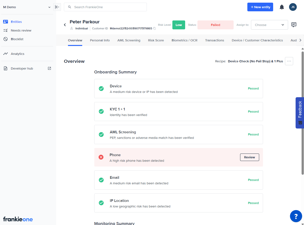 A Recipe is a list of checks that can be applied to a potential customer’s profile. In the API this is called an entityProfile.