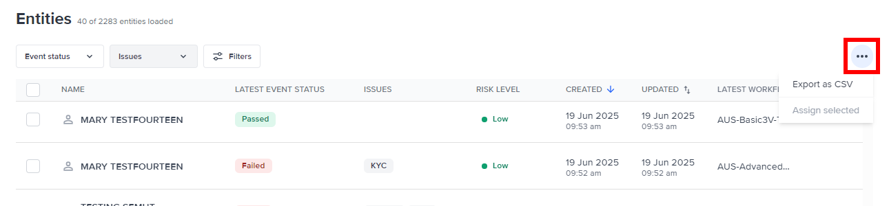 Selecting entities allows you to perform bulk actions. Select ”…” to see the actions allowed.